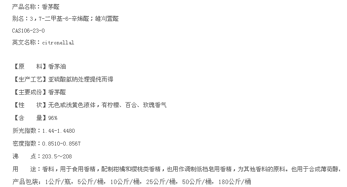 由香茅的全草经蒸汽蒸馏而得.淡黄色液体.有浓郁的山椒香气.主要成分是香茅醛、香叶醇和香茅醇。用于提取香茅醛,供合成羟基香茅醛、香叶醇和薄荷脑.也可用作杀虫剂、驱蚊药和皂用香料。